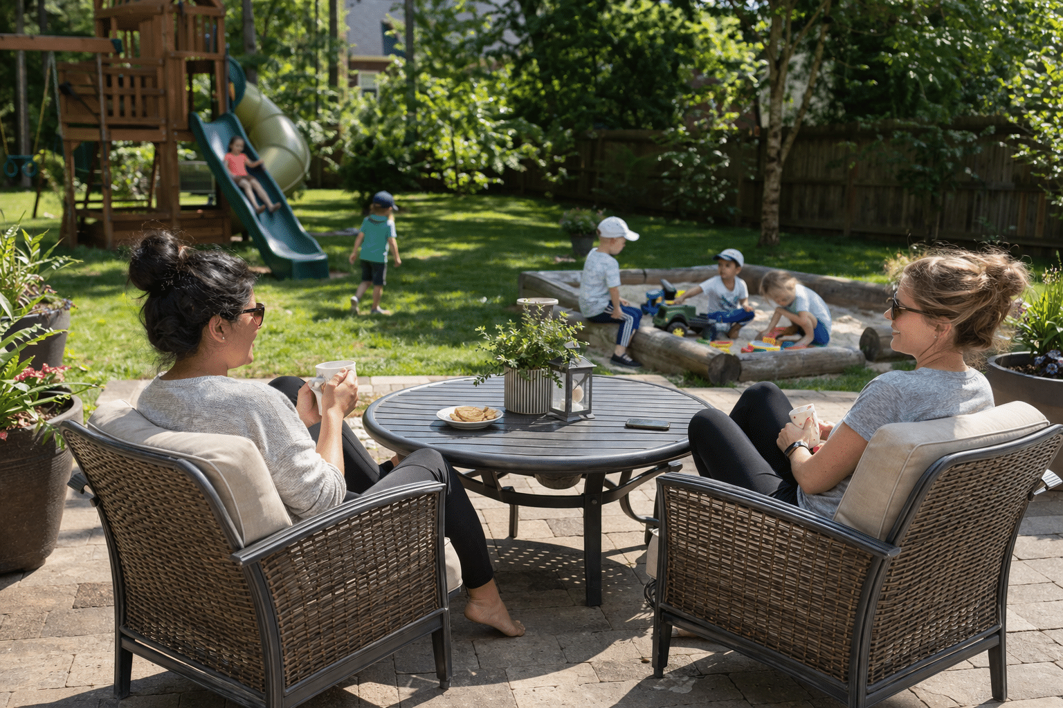 The kids are running around the backyard, someone’s goldfish crackers are definitely getting stepped on, and you’re finally — finally — sitting across from your friend at a playdate that took three weeks and approximately forty-seven texts to schedule.